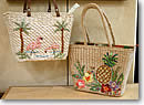 無造作に積まれたカゴの山も時間をかけて探せば、オシャレなアクセサリー・バッグに出会えます。写真のバッグは、ぶどうの刺繍が入ったライナーが可愛いバスケット(左)と、高そうに見えるアンティーク風ツートンバスケット(右)。左が$5.75、右が$6.50という激安プライスなので、ひと夏で消耗してしまっても絶対損はありませんよね。消耗してしまったバスケットは、鉢植えを入れたりフルーツを入れたりとインテリアとしてリサイクルしても良し。ショップへはザ・バスの6番でクック通りとクイーン通りの交差点で下車すぐ。またはカピオラニ通りを通るバスに乗り、クック通りで下車して海側へ1ブロック歩いてもOKです。 |
