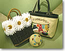 ◎ニーマン・マーカス カゴと言えば、「カジュアルウェアで元気よく」持つイメージ。その点、ちょっとよそ行き顔でフォーマルにも合うリッチアイテムとなると、やっぱりニーマン・マーカスが一番。ケイト・スペードのラウハラバッグは皮のハンドルとフタが、しっかり感を出しています。楕円形のフタ付きバスケットはベージュと緑、こげ茶とオレンジの2タイプあり、ポケットのある水玉模様のインナーがキュート。厚みがあるので、かさばるコスメもラクラク収納できます。かっちりしたシルエットで好感度抜群のショルダータイプは大小2サイズあり、ハンドルの色を赤、緑、茶の3つから選べます。思いっきりカジュアルに弾けたい時は、ハイビスカスのイミテーションフラワーがたくさん付いたカゴバッグを。カジュアルながらさりげない皮のハンドル使いが、さすがケイト・スペードといったところ。 |