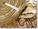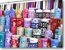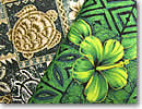 ブラリと見て回るだけでハワイの文化を垣間見ることができるのも、フラ・サプライ・センターの魅力。ショップの片隅に「タパ布」を発見しました。タパとは、木の皮をたたいて延ばしたもので、織物のなかったポリネシアでごく最近まで幅広く使われていたものです。柔軟性のあるタパは、彫刻を施した木版を押しつけて塗料をすり込み、模様を付けることもできます。もちろん、全てハンドメイド。素朴な風合いのタパは、タペストリーや間仕切りに最適です。そよ風に揺れるタパに、ハワイの情景を思い浮かべてみてはいかがですか。 |