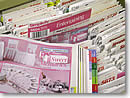 また、トリムやレース、ボタン、リボンなどのアクセサリー類も見逃せません。特に、ボタンの品数が多く、ボタンだけ買ってコレクションしたくなるような可愛いモノがいっぱい。ハワイアン・プリントでお部屋をデコレートして、ココナッツ・ボタンでアクセントを付ければ南国気分もひとしおですね。また、「ヴォーグ」や「マッコール」など有名ブランドのカタログ・パターン(下記コラム参照)も大きなキャビネットにギッシリ詰まっています。お店の近くには、ビーズの専門店「ビード・イット」やキルト・ショップの「キルツン・コア」などがあり、カイムキはクラフト好きにとって外せないスポットと言えそうです。 |