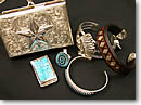 他のアクセサリー・ショップと違い、メンズ商品が充実しているのがこのお店。個性派必見のアイテムは、「シガレットケースのバックル」。職人による精巧なハンドクラフトが施されたシルバーのシガレットケースが、なんとベルトのバックルになっているという機能美。気になるお値段は1点$595! ハリウッド映画などでたまに見かける「マネークリップ」も1つ$30前後のシンプルなものから、ターコイズを埋め込んだ逸品まで豊富な品揃え。もちろん、カウボーイと言えば思い浮かぶ、ビーズやフェザー、レザーをお洒落なアクセントにした、時計やヘアアクセサリーも充実。また、ターコイズを埋め込んだアーミーナイフもバリエ豊富に揃っています。写真左側のナイフは、マネークリップにもなる「何通りにも便利」な逸品。お洒落なターコイズ細工の施された小さめのナイフは、女性にもピッタリです。 |