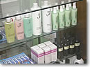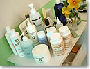 アカスリコーナー(上)、フェイシャルで使用する製品類(下) |
