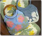 ■小物からベッドカバーまで大小さまざまなハワイアンキルトが勢揃い こぢんまりとした店内ながら、その商品の多さにはびっくり。小銭入れ、メガネケース、ポーチといった小物からバッグ、クッションカバー、ベッドカバーに至るまであらゆる形のハワイアンキルトがいっぱい。市販のハワイアンキルトはステッチがミシンで縫われているものも多いなか、ここの商品は手に取って見るとほとんどが手縫いであることを発見。ハワイアンキルトはもともとハンドメイドのものだから、市販とはいえ手縫いの温もりが感じられるのは嬉しいところ。 |