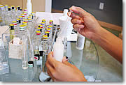 | ■ハワイでは全く新しいコンセプト アラモアナから山側へ徒歩15分ほどの所にあるケミストリーは、昨年9月にオープンしたバス&ボディグッズの専門店。3人のハワイ出身の若手実業家が、これまでなかった「香りを調合するコンセプト」をハワイに持ち込みました。実はこれ、米本土ではわりと知られたものなのだそうですが、ハワイではケミストリーが初めて。 では、香りを調合するとは実際にどういうことなのかというと… 店内に入ってすぐ目に入るのが中央のテーブルに並んだ小さなガラスのボトル。中にはクリアな液体が入っています。105種類以上あるというこれらは、ラベンダー、ミントといったエッセンシャルオイルをはじめ、シトラス、フローラル、グリーン系の香り、あらかじめ数種類の香りを合わせたフレグランス・オイルで、大手コスメ業界でも香水や化粧品に使用されているもの。これを様々に組み合わせて好みの香りを作る=調合します。作った香りを無香料のローションやクリームに混ぜればオリジナルのバス&ボディ・コレクションが出来上がるというわけ。 |