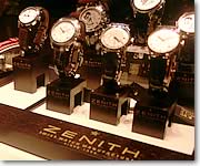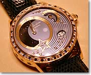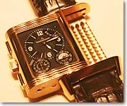 精巧なムーブメントを搭載した機械式時計の中でも1990年代から飛躍的に世界的な脚光を浴び始めたのがドイツのブランド、グラスヒュッテ。メンズで最も人気があるのが通称「パイロット・ウォッチ」と呼ばれるスタイル(写真左) 。オーバーサイズの文字盤の12時の部分に▲のマークがあるのが特徴です。お値段は$7,650と日本国内では考えられないほどリーズナブル。ジュエリー・ウォッチも注目です。ベゼルにサファイアとパヴェ・ダイヤモンドをあしらった「サマー・ナイト」という名前の時計($22,750、写真右)は、ラグジュアリーなスター・コレクションの一部。裏はスケルトンになっているのでムーブメントが見えるようになっており、フェイスには0.15ミリから0.18ミリの真珠母貝が敷き詰められています。精巧なムーブメントと贅沢なデザイン、そしてジュエリーが見事なハーモニーを奏でています。