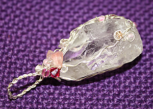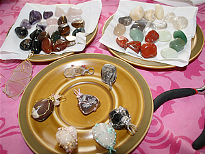 ■ポジティブな気持ちで楽しく作るのがコツ! でも、パワーストーンジュエリー作りにはこんなネガティブ思考は禁物なんだそうです。大丈夫。インストラクターの助けを得ながらなんとかワイヤーを巻き終わりました(笑)。その後は、工具を使ってチェーンを通すための輪を作り、クリスタルをデコレーション。たくさんの種類の天然石やビーズの中から自分の好きな物を選んで、それをワイヤーの間にはめ込みこんでいく作業です。私は、珊瑚色のチェリークオーツとグリーンの石、アベンチュリンをナオコ先生に手伝ってもらってつけました。最後にゆるんでいるワイヤーを丸め、やっとこで捻って、センターストーンにしっかりと固定できたら出来上がり! これってなかなか可愛くないか(笑)?