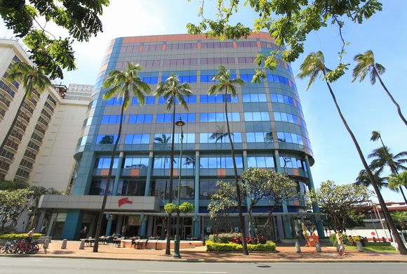 場所はワイキキの中心、ワイキキ・ビーチ・ウォークのすぐ近くにある「バンク・オブ・ハワイ・ワイキキ・センター」内で、1階にハワイ銀行が入っているビルです。