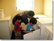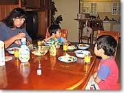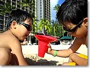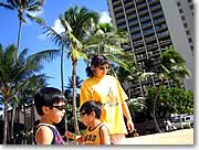 ■A6:料理といえるかどうかはわかりませんが、主に朝食を作っています。パンケーキ、ワッフル、サラダ、卵料理、そのほかは海辺で食べるおにぎりやそば、スパゲッティなどの麺類です。昨日は朝食にブルーベリー・ワッフルを作りましたし、到着翌日はエッグスン・シングスでパンケーキ・ミックスを買ってきて、パンケーキを作りました。今日はカレーを作っているので、明日もカレーです(笑)。よく買出しをするお店は、イヴァレイのコスコやダイエー、アラモアナ・センターのマカイ・マーケットが多いですね。コスコでは、500mlのお水を36本買って、重宝しています。 |