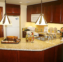 ■梶原:マリオット・コオリナ・ビーチクラブでは、ほとんどが2ベッドルームのユニットのようですが、私たちの所有している物件は、2ベッドルームのマウンテンビューです。ペントハウスなので、天井が高くてますます広く感じますね。アイランド風のインテリアも凝っていてゴージャスです! |