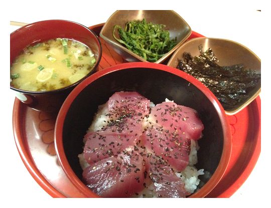 ◎釣りたてマグロの漁師どんぶり 3月から9月頃まではハワイの釣りバカはアヒ(マグロ)がやってくる!と大喜び。ハワイで釣れるマグロはキハダ。たまにメバチも釣れます。そんな釣ったばかりのマグロの刺身を、アツアツの白いご飯の上にのせた丼が私の元気の源。黒ゴマ、青ジソ、刻み海苔をのせ柚子わさびをダシ醤油と混ぜてかけて頂きます。アンティ・アヤ流、漁師どんぶりです。 |