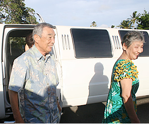 さあ、いよいよメモリアル・ウエディング当日。会場はワイアラエ・ビーチ・パーク。オアフ島でも有数の高級住宅地カハラ地区の一番奥、ソニー・オープンが行われることで良く知られるワイアラエ・ゴルフ・コースや、珠玉のリゾート「ザ・カハラ・ホテル&リゾート」に隣接した風光明媚なところです。 サンセットの時間に合わせてウエディングが行われるため、ホテルを出たのは午後4時半。銀婚式を迎える中村さんご夫妻と一緒にストレッチ・リムジンに乗り込んで、一路ワイアラエ・ビーチ・パークへ。美しいハワイの風景を見ながら、ワイキキから約15分で到着です。会場には、フランク・マック牧師、ジョイフルウエディングズ・イン・ハワイのハワイオフィスCEOのカレン・マックさんたちが待ってくれていました。優しい笑顔の2人にホッとしながら挨拶をする定藤さんご夫妻。