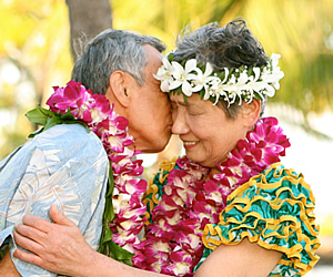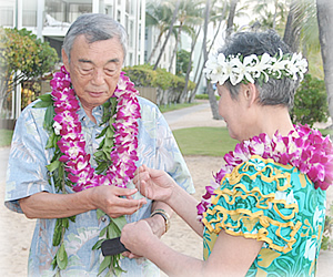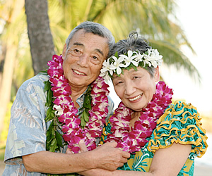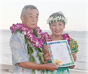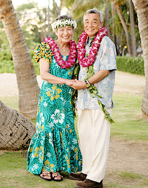 ハワイで金婚式&銀婚式、感動のメモリアル・ウエディング! (前編:金婚式編)兵庫県在住の定藤公冶さんと春子さんは、今年金婚式(結婚50周年)を迎えます。「何か記念になることを両親にプレゼントしたい」と、長女の片山文里さんがジョイフルウエディングズ・イン・ハワイ10周年記念の「メモリアル・ウエディング・プレゼント」に応募したところ、見事当選! この企画は、ハワイのビーチウェディングJ社の創業10周年を記念し、2008年に結婚50周年と25周年を迎えられるご夫婦各1組にメモリアル・ウエディングつきのハワイ旅行がプレゼントされるという嬉しいもの。プレゼントには、ハワイへの往復航空券、ワイキキパーク・ホテルへの宿泊(3泊5日)、ホノルル空港とホテル間の往復送迎、朝食3回分、専属牧師立会の挙式料、結婚証明書、フォトCD-R、ハワイアン・シンガー、リムジン、レイ2個、ハワイのガイドブック、日本語の話せるコーディネーターが含まれます。