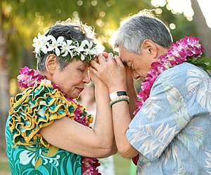 今年創業10周年を迎える、ジョイフルウエディングズ・イン・ハワイの特別企画として、 今年結婚50周年(金婚式)と25周年(銀婚式)を迎えるご夫婦1組ずつに、メモリアル・ウエディングつきのハワイ旅行がプレゼントされました。この記念すべき企画に当選されたラッキーなご夫婦は、金婚式が兵庫県の定藤さんご夫妻、銀婚式が福岡県の中村さんご夫妻です。金婚式と銀婚式を迎えるベテランカップル2組が揃って、ハワイの美しい海辺でこれからも変わらぬ愛を誓った、感動のメモリアル・ウエディングの模様を、どうぞお楽しみください。