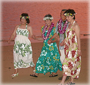 | ■どうしよう、涙が止まらない… 感動のセレモニー ワイアラエ・ビーチに夕日が少しずつ沈み始めるころ、お式が始まりました。まずは、それぞれのご夫婦がお互いにレイをプレゼント。春子さんが公治さんの頬に軽く唇を寄せると、「あのような両親の姿を見たのは初めて」とビックリしながらも思わず涙ぐむお嬢さんたち。一方、春子さんの瞳からもポロポロと大粒の涙がこぼれ落ちます。公治さんも緊張した様子ですが、感動に思わず胸が詰まった様子で、じっと春子さんの手を握っておられたのが印象的でした。 そのあと、マック牧師から「本日は、公治さんから春子さんにサプライズプレゼントがあります」との思わぬアナウンスが。「今まで本当にありがとう」と、公治さんから春子さんに渡された小箱。春子さんの目からは涙が止まりません。小箱の中身は公治さんが内緒で用意していた、春子さんの大好きなアクセサリー・ブランドのすてきなペンダントでした。