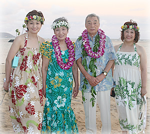 「当選の知らせを聞いたときは、びっくりしてしばらく信じられませんでした」と文里さん。さっそくご両親と妹さんに連絡し、家族でハワイに出かけることになりました。2人のお嬢さんがそれぞれ結婚し家を出てからは、4人だけで出かけることもほとんどありませんでしたが、今回久しぶりに昔のように4人で揃って旅行することができました。ハワイについて、ワイキキパーク・ホテルにチェックイン、午後からは当日に控えた結婚式の打合せです。やはりハワイ挙式にはハワイならではのスタイルで臨みたいということで、ご両親は色彩がマッチしたアロハシャツとムームー、お嬢さん2人は胸元のシャーリング使いがおしゃれな柄違いのハワイアン・プリントのドレスを用意しました。