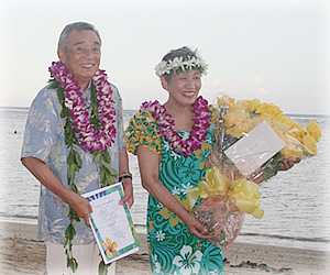 マック牧師と挨拶を終えた一行は、いよいよ近くの挙式場所へと向かいます。静かな海はどこまでも穏やかで、少しずつ夕日が傾きはじめてきました。まさにハワイの自然に溶け込んだビーチ・ウエディングならではの、のどかで心癒されるひととき。比較的人も少なく、白い砂と青い海、遠くに見えるココ・ヘッドが抜群の眺望を描くワイアラエ・ビーチは、世界中から多数のカップルが結婚式を挙げに来る場所として有名です。 さあ、椰子の木に囲まれた挙式場所に着きました。ハワイアン・シンガーがウクレレで優しく奏でる「ハワイアン・ウエディング・ソング」の調べに乗せて、ご夫婦で静かにマック牧師の待つ場所に向かって歩き出しました。公治さんがサッと春子さんの手をとります。 |