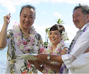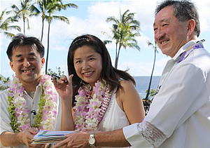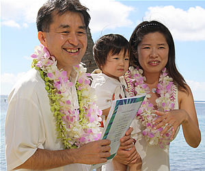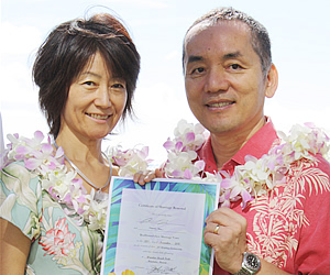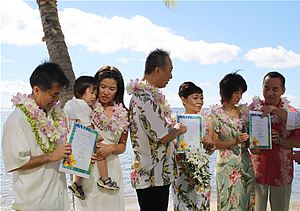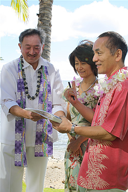 | 2010年11月22日(月)は、「いい夫婦(1122)の日」ということで、創業12年の実績を持つ「ハワイのビーチウェディングJ社」の特別企画として、 結婚10年、20年、30年以上のご夫婦1組ずつにハワイのビーチで挙げる「メモリアル・ウエディング」がプレゼントされました。この記念すべき企画に当選されたラッキーな3組のカップルによる、感動的なセレモニーの様子をお届けいたします。 | ![]() |