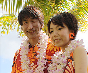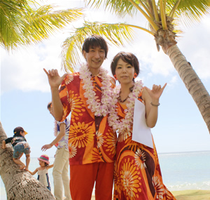 それからもうひとつ、今回のハワイ・ウエディングは、なんと3組が所属するグループ「ママ・ファミリー」の会長さん、小川祐丘・恵美子夫妻からの可愛い弟子たちへのプレゼントなのだそうです! まずは、カップルのご紹介です。 <10月11日に入籍されたばかりの原正則、愛夫妻> 職場が一緒で知り合ったという、まだ新婚ホヤホヤのお2人。ハワイで調達されたという、お揃いの鮮やかなオレンジ色のアロハとドレスが、ハワイの青い空と海にビビッドに調和していてとても素敵です。