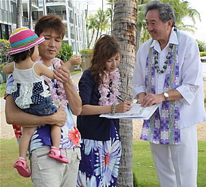 今回の挙式の発起人の小川祐丘さんが聖書の一節を読み、その後は、レイ交換のセレモニーが始まります。ハワイの古代から伝わる伝統によると、レイは指輪と同じように、丸くて途切れることがないので、「お互いの永遠の愛を誓う」という意味合いがあるそうなんです。なんとロマンチック。レイ交換は、夫から妻へ、妻から夫へ、そしてお互いの頬に優しくキスを交わします。夫婦たちは微笑みながらお互いの目を見つめ合い、手をしっかり握り合っています。その後は結婚証明書にサインして式が終了。 挙式の後にそれぞれのカップルに、ビーチウエディングの感想をお伺いしました! 原さんご夫妻:「すごく感動しました! ハワイは初めてですが日本と違ってとてもリラックスできる場所だな、と思いますね。これからも2人でずっと仲良くがんばっていきます」