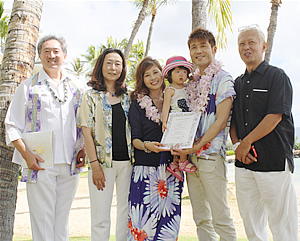 吉原さんご夫妻:「良い想い出になりました。ビーチでのウエディングはとても気持ちが良かったですね。これからの抱負は、楽しい家庭を作っていくことですね。家族皆で仲良くやっていきたいです」 柴山さんご夫妻: 「楽しかったです。小川会長のような楽しくて温かくて大きな家庭を築きたいですね。家族でいつも仲良くいたいです」 また、ウエディングのプレゼントの主である小川祐丘さんからはなむけの言葉を一言。「末永くお幸せに。子づくりもがんばってくださいね」。また、今回挙式にハワイのビーチウエディングを選ばれた理由を聞きました。「僕自身がハワイが大好きで1年に3、4回は来ているんですよね。気候が良いのでハワイを選びました。ハワイは自然が最高ですよね」。 ウエディングの後には、バロンさんの演奏で、参列者の一人へバースデー・ソングがプレゼントされたり、子どもたちがビーチを走り回ったりヤシの木に登る姿も見られ、とても和やかでアットホームなウエディングでした。また、祐丘さんの後輩への思いやりのように、アロハもたっぷり詰まったハワイにぴったりの式でした。今日のハワイの静かで大きな海と空のように、皆さんの末永い愛を祝福します。 |